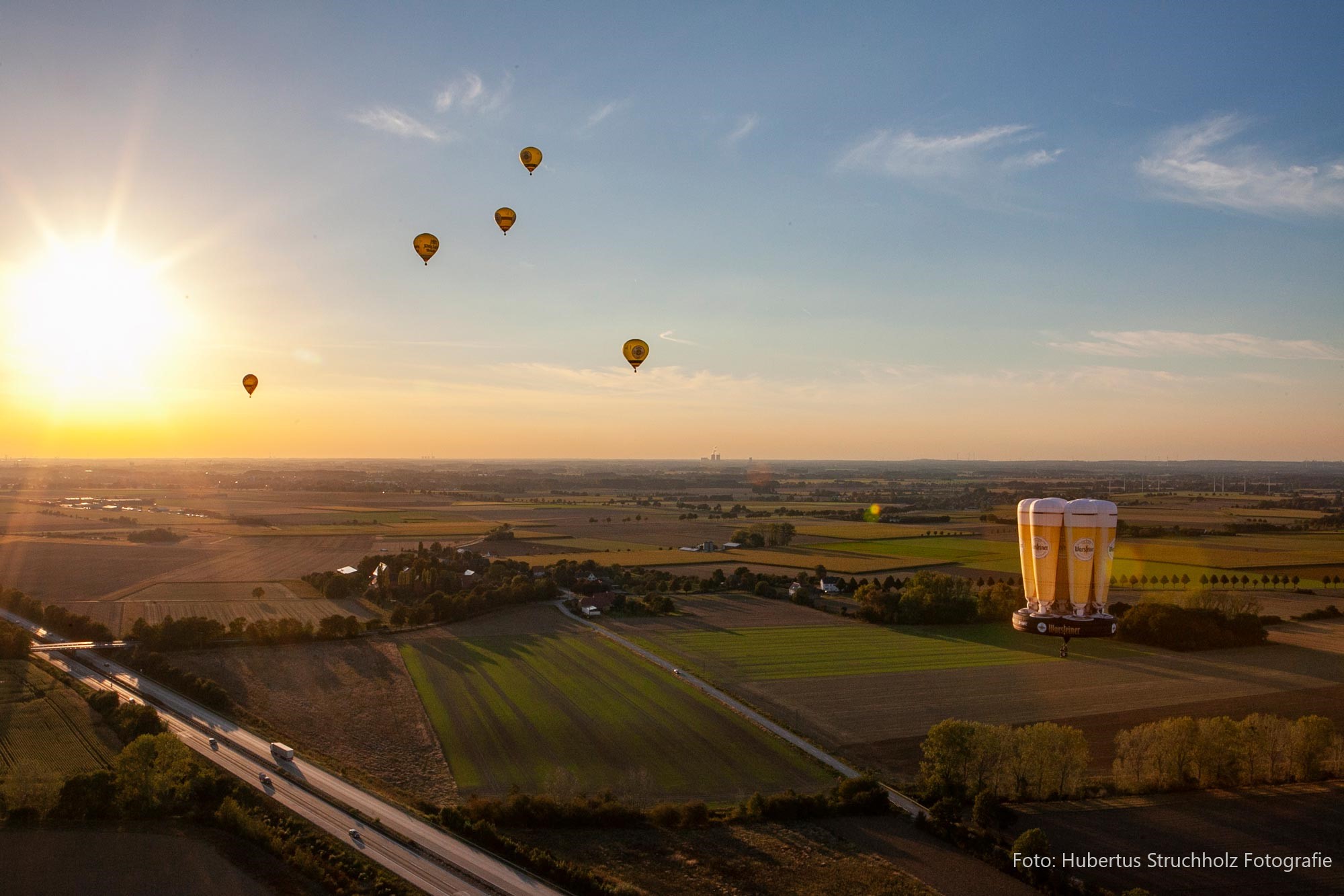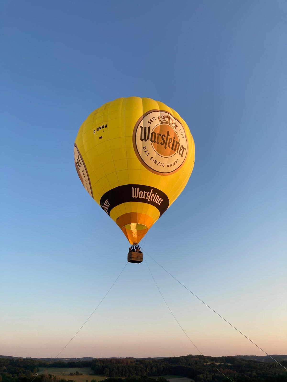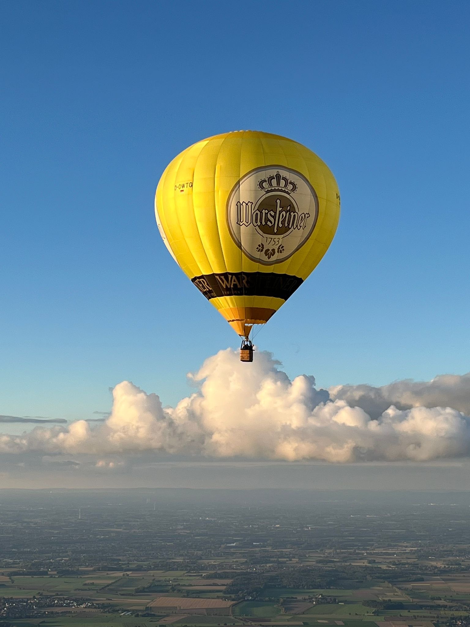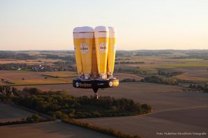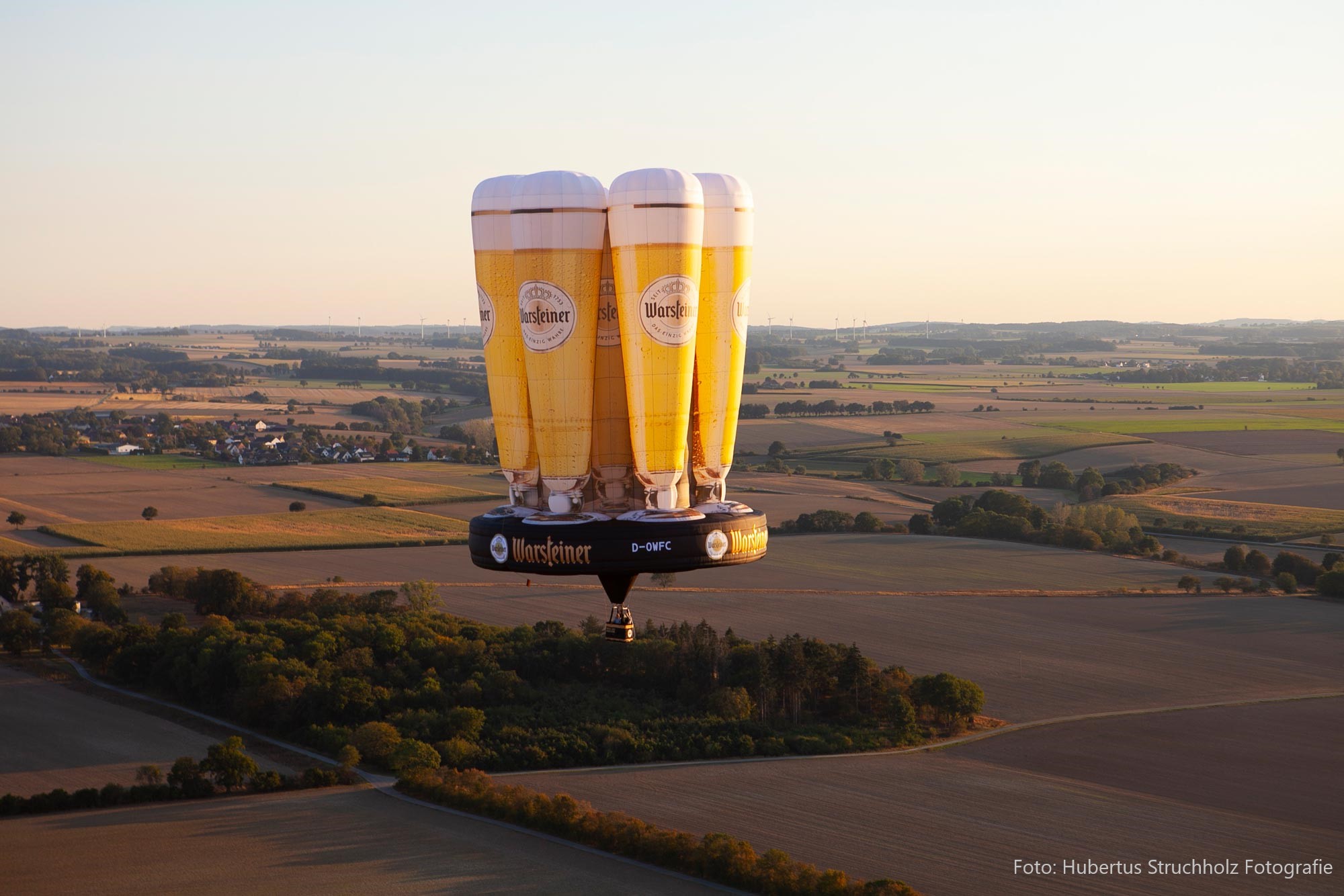 Ein echtes Highlight unserer Flotte: der Ballon „Cheers“! In Form eines riesigen Biertabletts mit Warsteiner-Biertulpen sorgt diese Sonderform bei jedem Start für staunende Blicke – am Boden wie in der Luft.