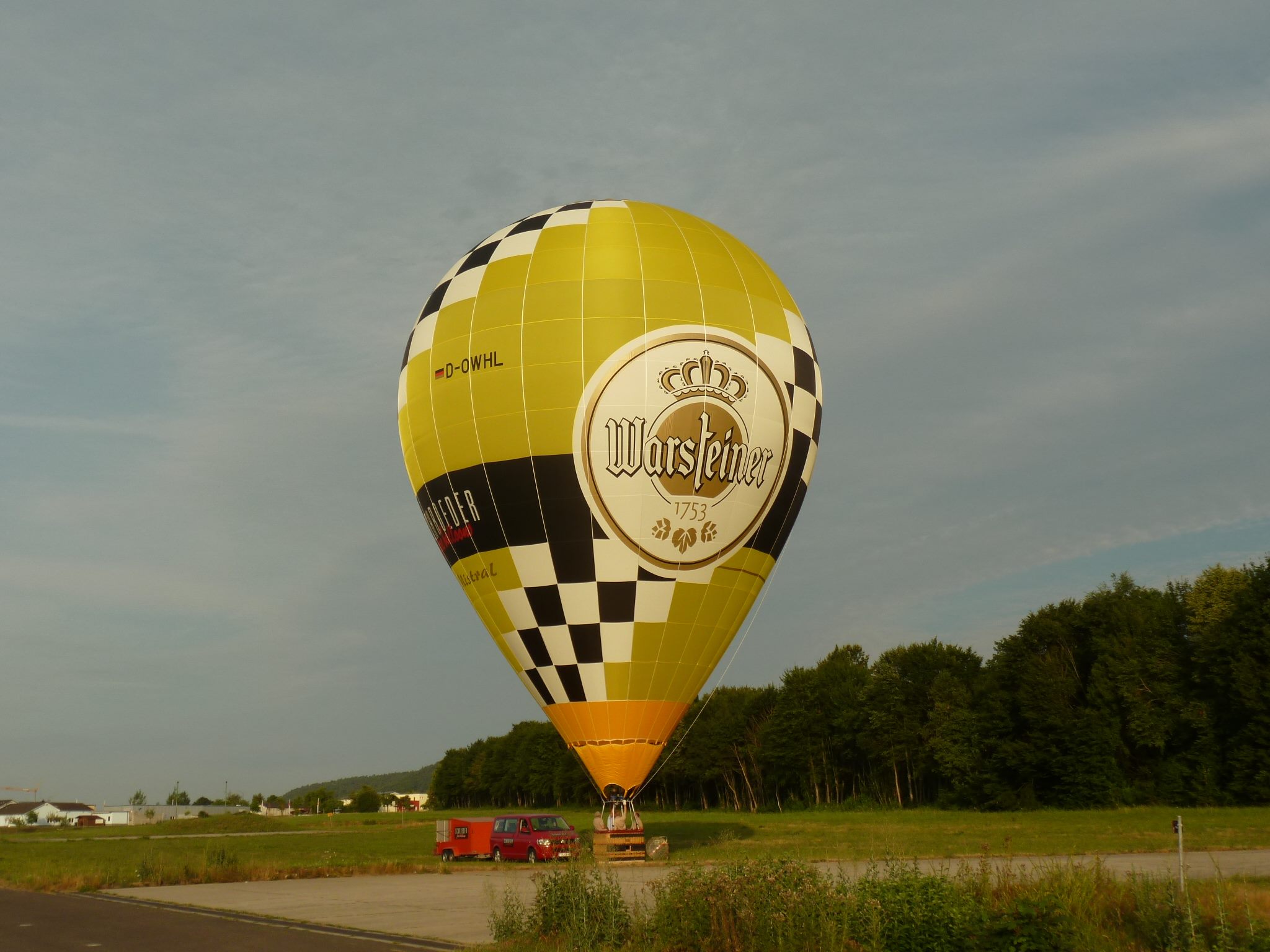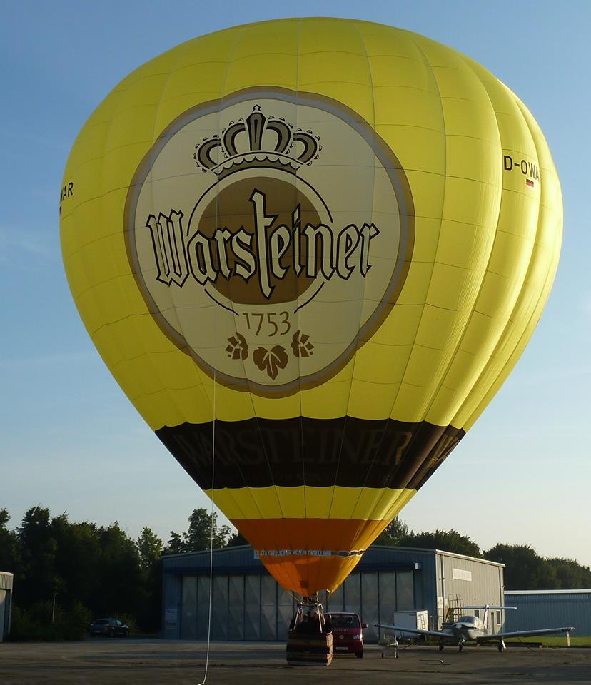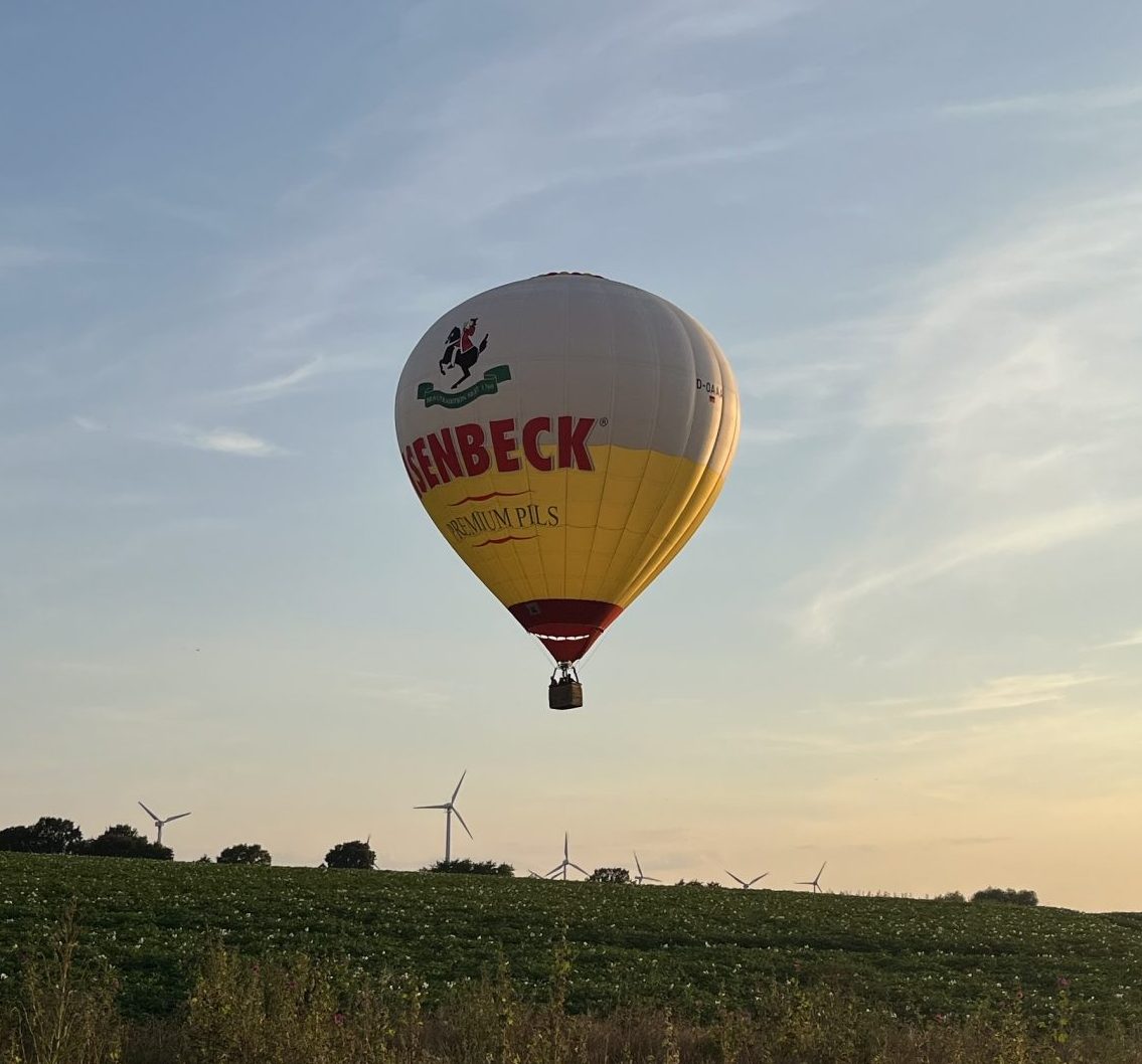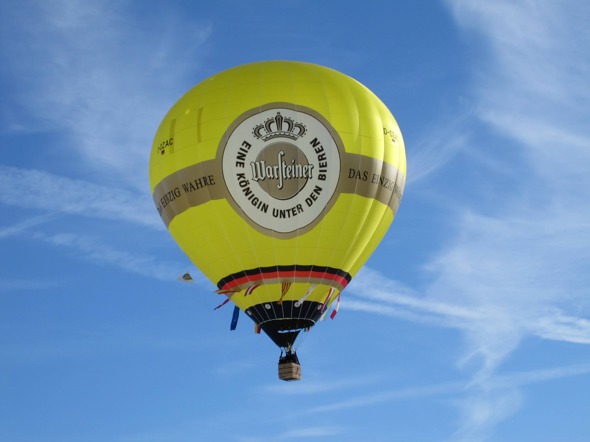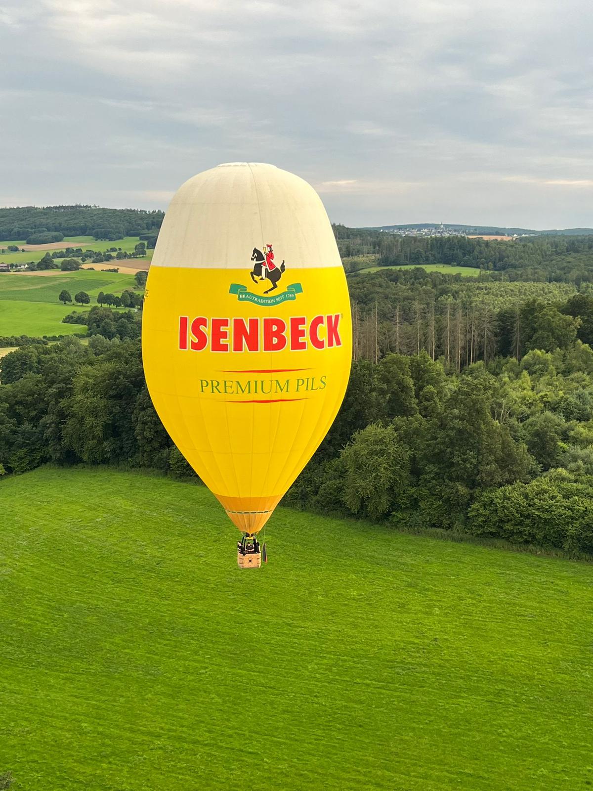 Ein echtes Highlight unserer Flotte: der Ballon „Cheers“! In Form eines riesigen Biertabletts mit Warsteiner-Biertulpen sorgt diese Sonderform bei jedem Start für staunende Blicke – am Boden wie in der Luft.